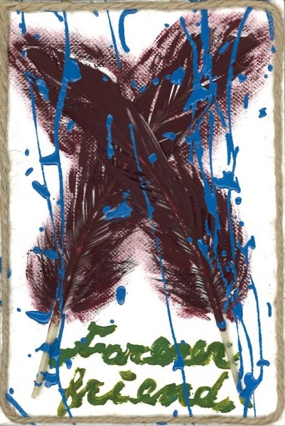 作品名:「ずっと友達」 本物の羽が大胆に貼り付けられている