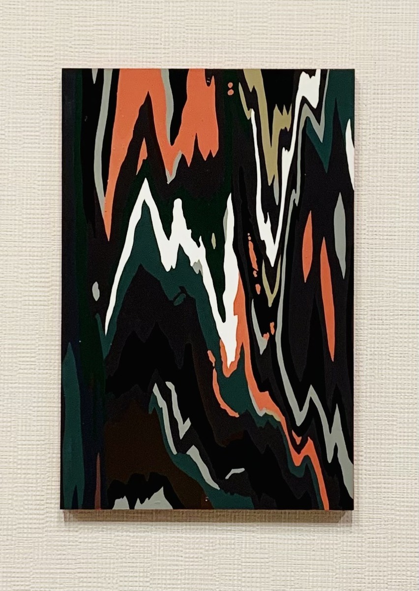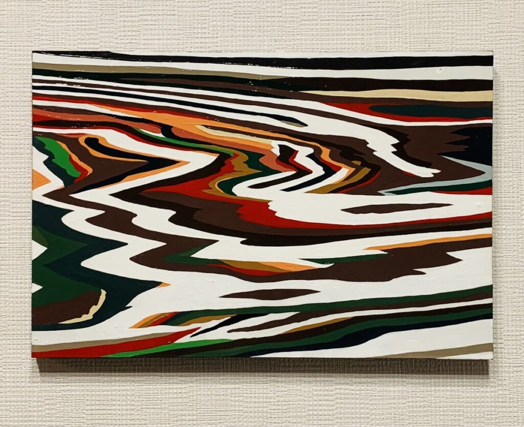 それもありますし、僕が出品している作品は、ほとんどが模様みたいな、抽象的な作品で、壁に飾ってインテリアとして楽しんでいただくような作品として出しているんです。壁画に描いていたような家などの建物を描くなら、かわいらしい雰囲気を出そうとしてかわいい色も使いますが、抽象画の場合はインパクトを与えたいので、濃い色を選びますね。ただ、最近はその画風も変化しています。