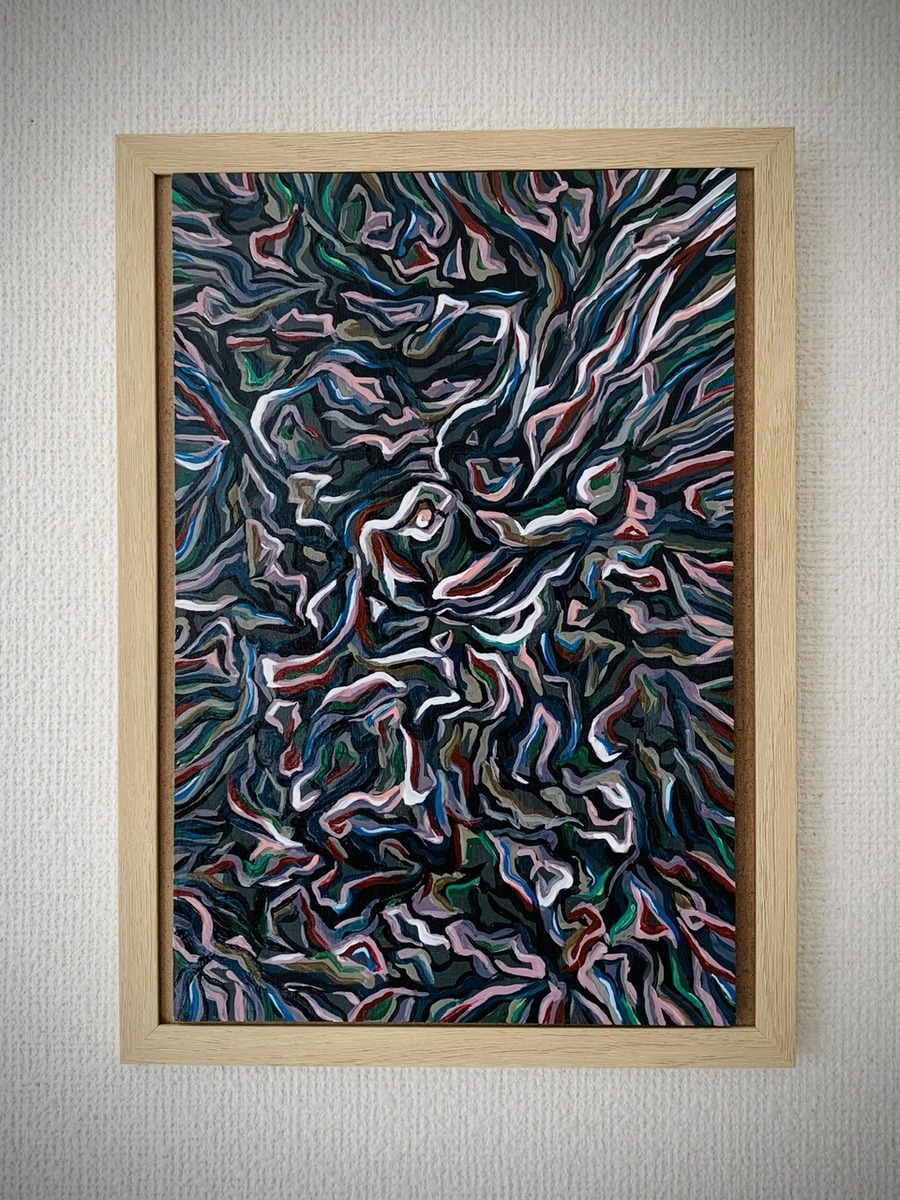 抽象的な絵なので、その絵のバックグラウンドというか、こういうことを描いています、というストーリーだけは明確にしたいんです。それが自分のこだわりです。ご購入いただいた方に、ストーリーも併せて持って行ってもらいたいんです。意味を必ず持たせる、これも絵の大事な一部だと思っています。なかなか思いつかなくて苦しいこともありますけどね。