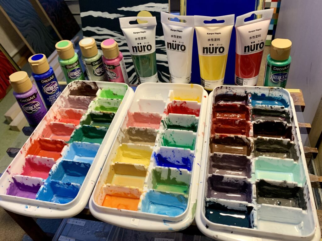 ペンキを混ぜて、あらかじめ30色以上は色を作って容器にストックしています。教えてくれる人がいないので、全部試行錯誤しながら自己流で学んでいます。